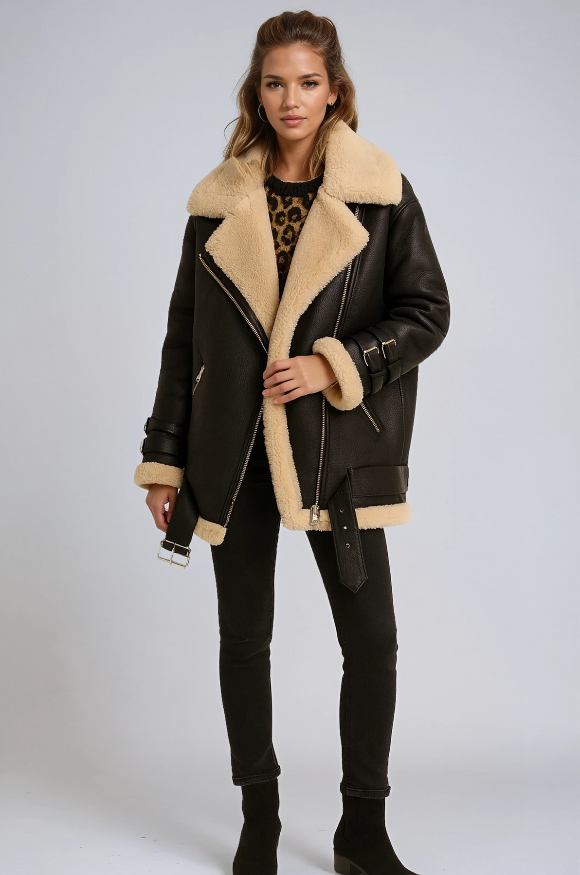 ✔ Luxurious sheepskin lining — envelops you in warmth and softness ✔ Wide collar with fur trim — adds an element of refined elegance ✔ Straps with buckles — a contemporary twist on a classic design ✔ Side zip closure — infuses a rock-chic vibe into your ensemble ✔ Suede finish — exudes understated sophisticationDETAILS
